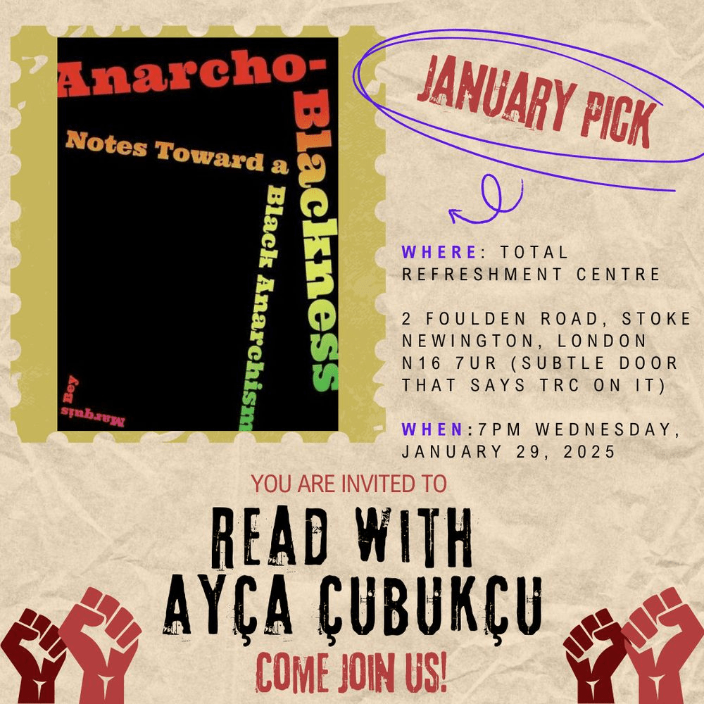 London, what are you reading this month? Come join us to discuss Anarcho-Blackness: Notes Toward a Black Anarchism by Marquis Bey Wednesday, January 29, 2025 at 7 pm, Total Refreshment Centre, Stoke Newington, London