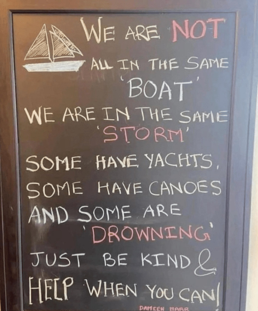 we are not all in the same boat..ee are all in the same storm..some are on super-yachts..some have just the one oar – Damian Barr.