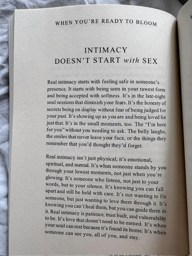 reali intimacy starts with feeling safe in someone’s presence. it starts with being seen in your rawest form and being accepted with softness.. it’s in the late-night soul sessions that diminish your fears. it’s the honesty of secrets being on display without fear of being judged for your past.. it’s showing up as you are and being loved for just that.. it’s someone who listens, not just to your words, but to your silence. it’s knowing you can fall apart and still be held with care. it’s not wanting to fix someone, but just wanting to love them thru it. it’s knowing you can’t heal them, but you can guide them to it.. real intimacy is.. vulnerability to be. it’s love that doesn’t need to be earned. it’s when your soul can rest because it’s found its home. it’s when someon can see you, all of you, and stay.