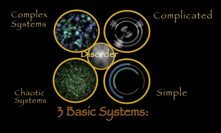 2 min – we take the 3 basic systems: ordered, complex, chaotic.. we create a new category called disorder.. and we divide ordered into 2.. simple and complicated