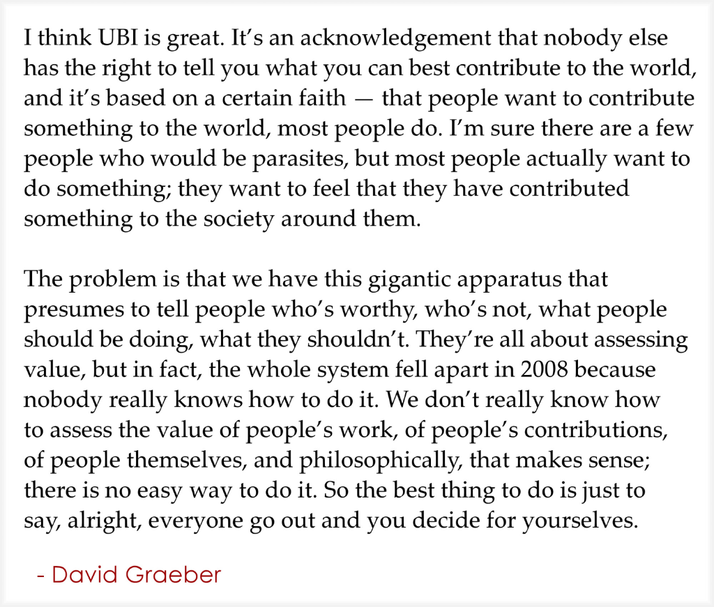 ‘i think ubi is great.. an acknowledgment that nobody else has right to tell you what you can best contribute to the world.. and it’s based on a certain faith – that people want to contribute.. the problem is we have this gigantic apparatus that presumes to tell people who’d worthy.. what people should be doing.. best thing to do is just to say, alright everyone go out and you decide for yourselvess’ – david graeber