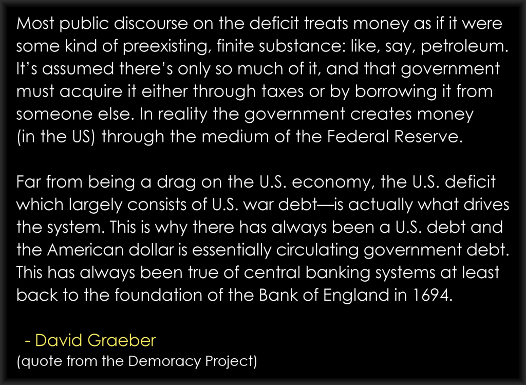 here we come to the central question of this book: what, precisely, does it mean to say that our sense of morality and justice is reduced to the language of a business deal?…. how do we speak about them (debts/obligations) when our language has been so shaped by the market? .. money’s capacity to turn morality into a matter of impersonal arithmetic.. to justify things that would otherwise seem outrageous or obscene. when one looks a little closer, one discovers that these two elements – the violence and the quantification – are intimately linked. the way violence, or threat of violence, turns human relations into mathematics will crop up again and again over the course of this book. it is the ultimate source of the moral confusion that seems to float around everything surrounding the topic of debt…. still lies underneath the essential fabric of institutions today … we’re no longer capable of even perceiving (freedom, morality, sociality) because we can no longer imagine things any other way.. [..] there’s nothing new about virtual money. actually, this was the original form of money. [..] the one thing all these misconceptions have in common, we will find, is that they tend to reduce all human relations to exchange, as if our ties to society, even to the cosmos itself, can be imagined in the same terms as a business deal. this leads to another question: if not exchange, then what? in chapter five, i will begin to answer the question by drawing on the fruits of anthropology to describe a view of the moral basis of economic life; then return to the question of the origins of money to demonstrate how the very principle of exchange emerged largely as an effect of violence – that the real origins of money are to be found in crime and recompense, war and slavery, honor, debt, and redemption. [..] for a very long time, the intellectual consensus has been that we can no longer ask great questions. increasingly, it’s looking like we have no other choice.– – – – debt via wiki http://en.wikiquote.org/wiki/David_Graeber