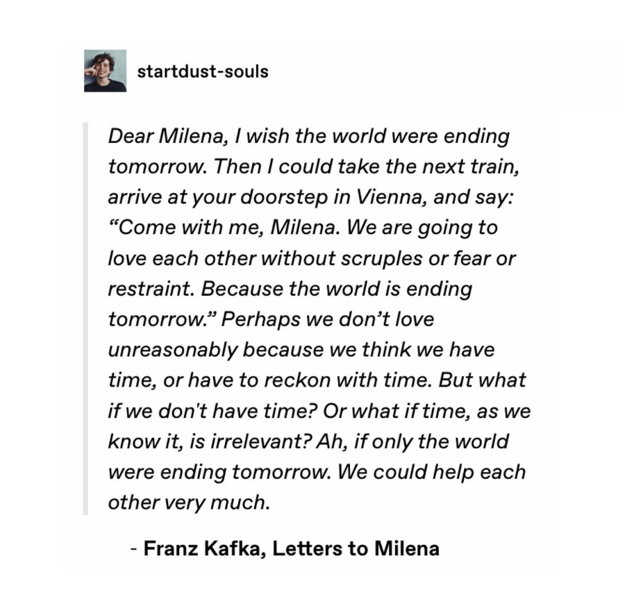perhaps we don’t love unreasonably because w e think we have time, or have to reckon w time.. but what if we don’t have time? or what if time, as we know it, is irrelevant? – franz kafka