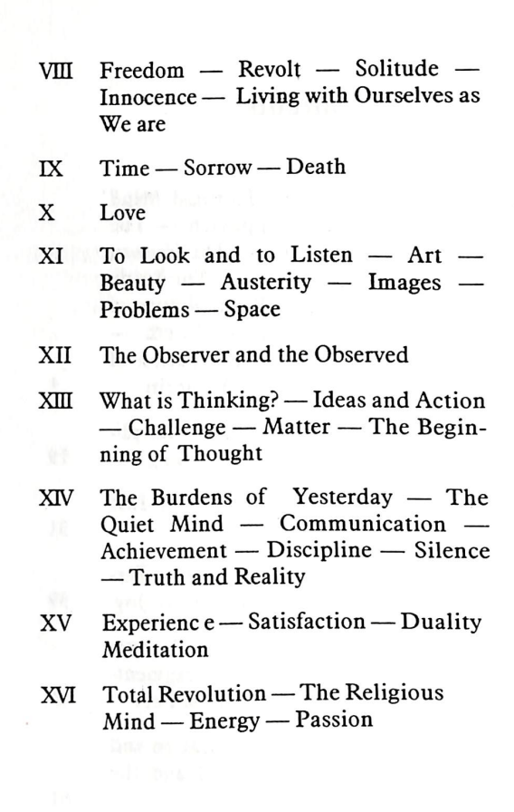 [man’s search.. the tortured mind.. the traditional approach.. the trap of respectability.. the human being and the individual.. the battle of existence.. the basic nature of man.. responsibility.. truth.. self transformation.. dissipation of energy.. freedom from authority]