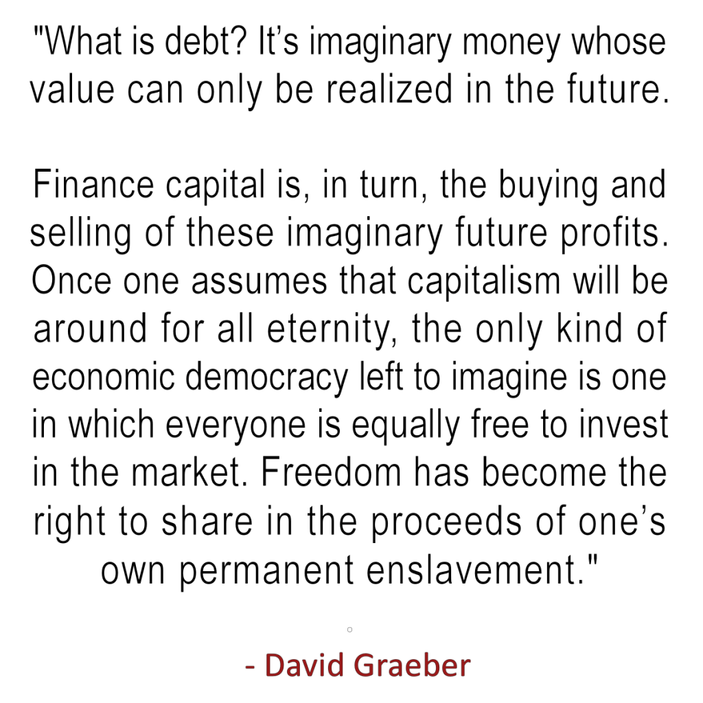 Debt is the most efficient means ever created to make relations fundamentally based on violence and inequality seem morally upright.” From, The Machinery of Hopelessness by David Graeber (2011). https://voidnetwork.gr/2011/09/22/the-machinery-of-hopelessness-by-david-graeber/