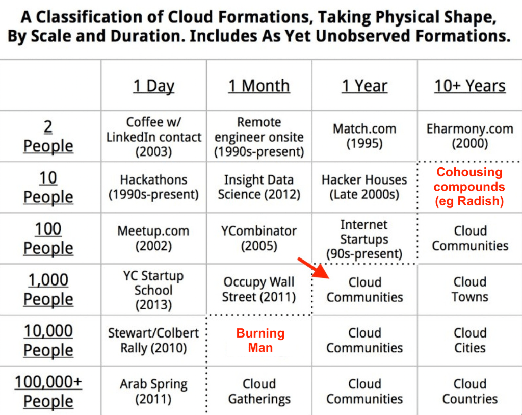 A decade ago, Balaji shared this classification of cloud formations, which charts form factors for network societies by scale and duration..t The dotted line indicates the frontier of “unobserved formations”. I’ve added a red arrow to indicate where popup villages are pushing out the frontier: