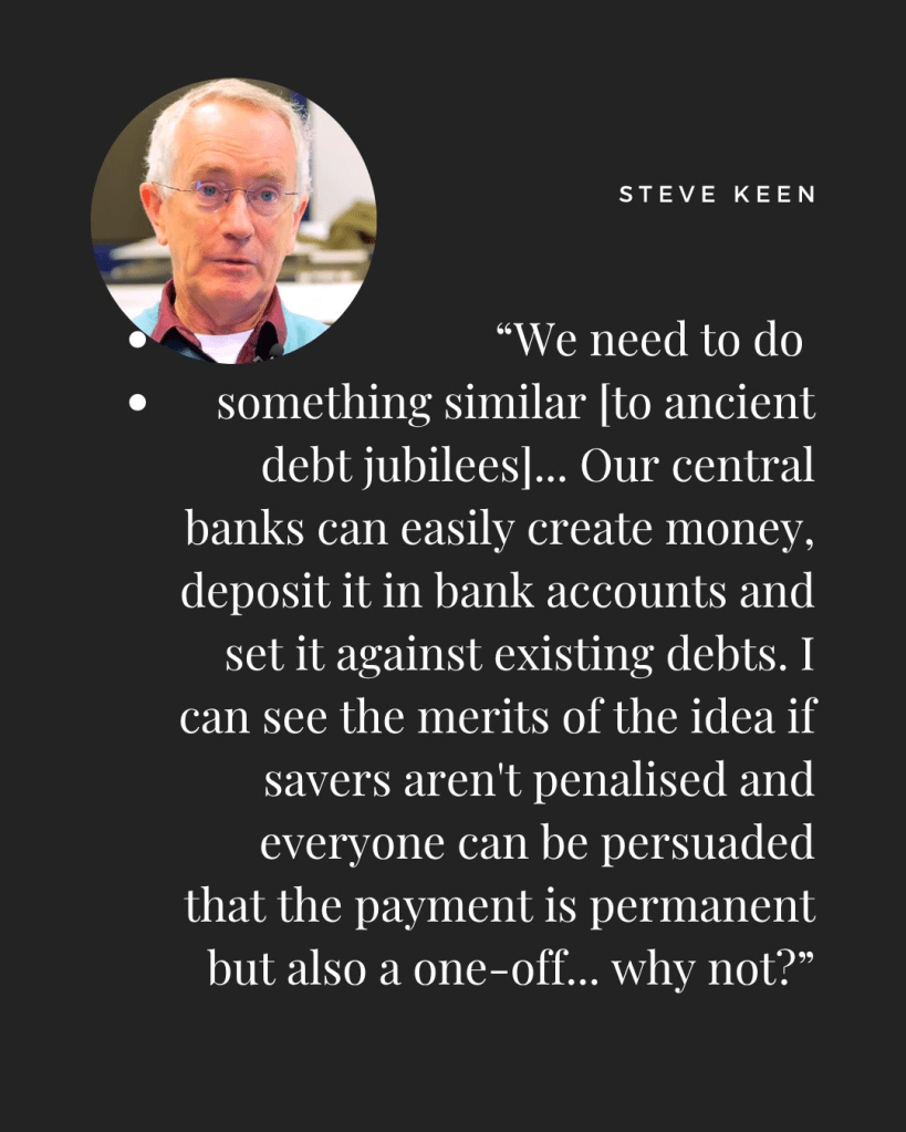 we need to do something similar (to ancient debt jubilees).. our central banks can easily create money, deposit it in bank accounts and set it against existing debts.. i can see the merits of th eidea if savers aren’t penalised and everyone can be persuaded that the payment is permanent but also a one-off.. why not?’
