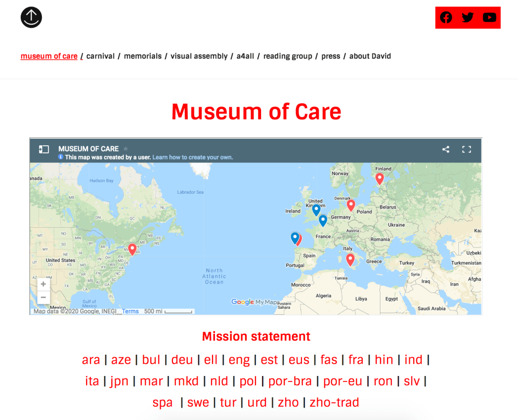 (https://twitter.com/nikadubrovsky/status/1316726730569199618?s=03)The Museum of Care will be a series of residences distributed worldwide (one of which will be located in Fire Island – the home of David Graeber). We understand the Museum of Care not as a place to archive and preserve things but to create and nurture social relationships. An international network of physical spaces where people can connect, think, write, create and organise.