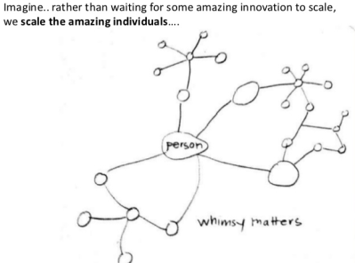 Most of us like shiny things, we like to see answers. But even if we did find a silver bullet solution – to redefining public ed, or whatever, it would never exponentiate the hastening of equity and the ongoing sustainability, the thrivability, as much as scaling the individual would.