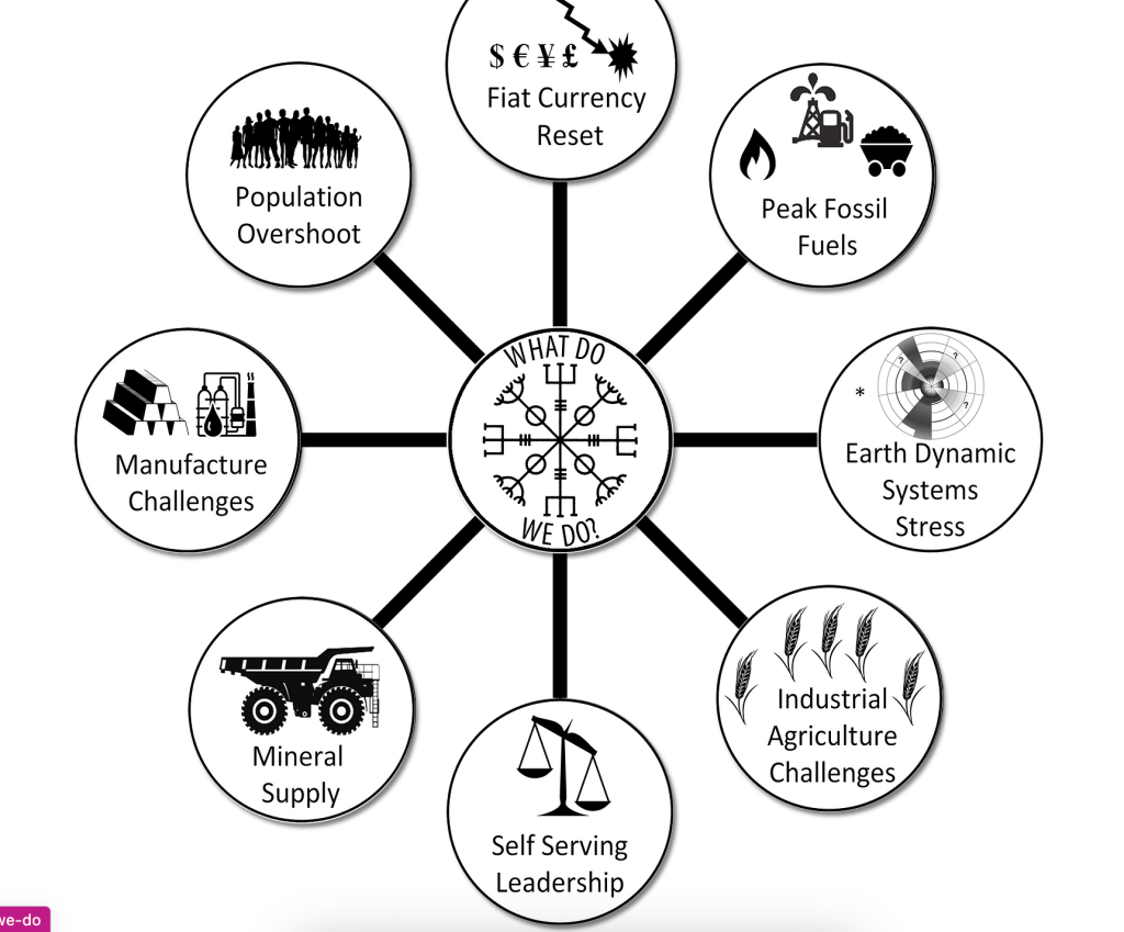 My work is based on the following principles/observations: I see all things as a system and examine them accordingly; All wildlife systems are in steep decline; The current industrial system is highly dependent on fossil fuels (oil, gas, and coal); Oil, gas, and coal all have unique applications that the current industrial system is dependent on; Gas forms a buffer between supply and demand in electrical power generation; Coal is used by industry to generate high temperature heat for manufacturing and smelting; 81% of existing oil fields are declining at a rate of 5 to 7% per year; Peak oil could be in our past (Nov 2018), but we won’t know until Nov 2023; We are looking at radical changes forced on industrial systems, economic systems and the social contract for society; The basic concepts of how our global system works as described by the Limits to Growth project are correct; As we transition to a lower energy system (renewables replacing fossil fuels), growth-based economics will be phased out and replaced with something else; The task to phase out fossil fuels is much larger than first thought; Current renewable energy systems generally have a lower Energy Returned on Energy Invested ratios (ERoEI) than current fossil fuel-based systems; Most renewable technologies also require the use of relatively exotic metals like lithium, cobalt and Rare Earth Elements; The first generation at least will have to be manufactured using metals sourced from the mining of minerals; Both current mining production (2019) and current stated global mineral reserves (2022) cannot provide sufficient metal to manufacture only one generation of renewable technology units (EV’s, H-cells, batteries