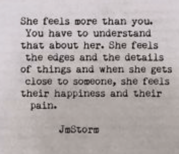 storm understand law: she feels more than you.. you have to understand that about her.. she feels the edges and the details of things and when she gets close to someone, she feels their happiness and their pain jim storm