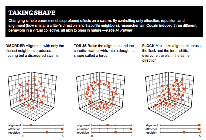 In 2002 Couzin cracked open the software and focused on its essential trinity of attraction, repulsion, and alignment. Then he messed with it. With attraction and repulsion turned up and alignment turned off, his virtual swarm stayed loose and disordered. When Couzin upped the alignment, the swarm coalesced into a whirling doughnut, like a school of mackerel. When he increased the range over which alignment occurred even more, the doughnut disintegrated and all the elements pointed themselves in one direction and started moving together, like a flock of migrating birds. In other words, all these different shapes come from the same algorithms. “I began to view the simulations as an extension of my brain,” Couzin says. “By allowing the computer to help me think, I could develop my intuition of how these systems worked.”