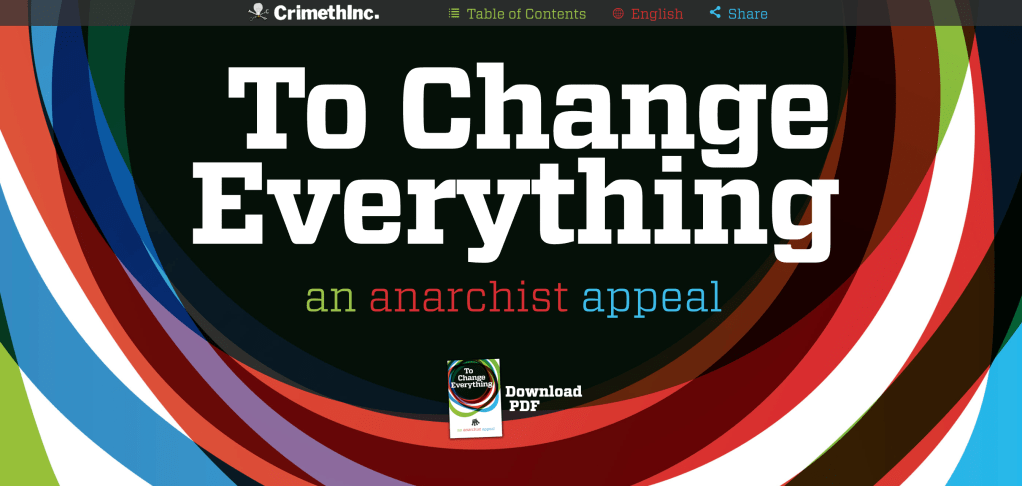 Welcome to everyone who is just now following us! We are a thirty-year-running all-volunteer anarchist collective involving participants on several continents. Everything we do is collectively produced, anonymous, and not for profit. Here’s a short introduction to our work: tochangeeverything.com