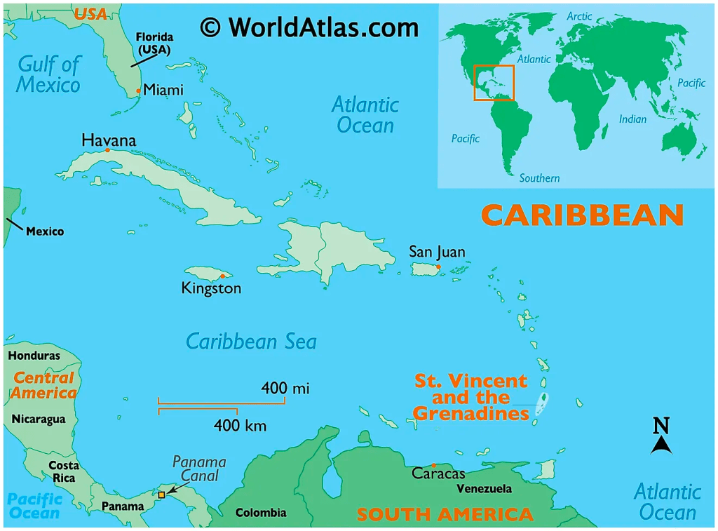 St Vincent and The Grenadines lies in the eastern Caribbean Sea. It is made up of the island of St Vincent and the northern Grenadines, a group of 32 smaller islands and cays (low banks of coral or rock) to the south. The southern Grenadines are part of Grenada.